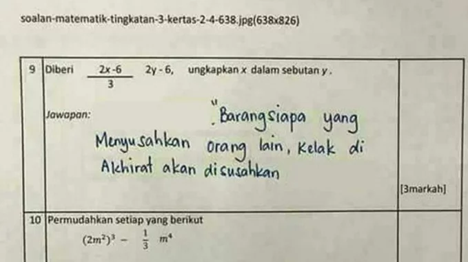 >>Karena nggak bisa jawab, siswa ini malah menulis hadis dilempar jawabannya.