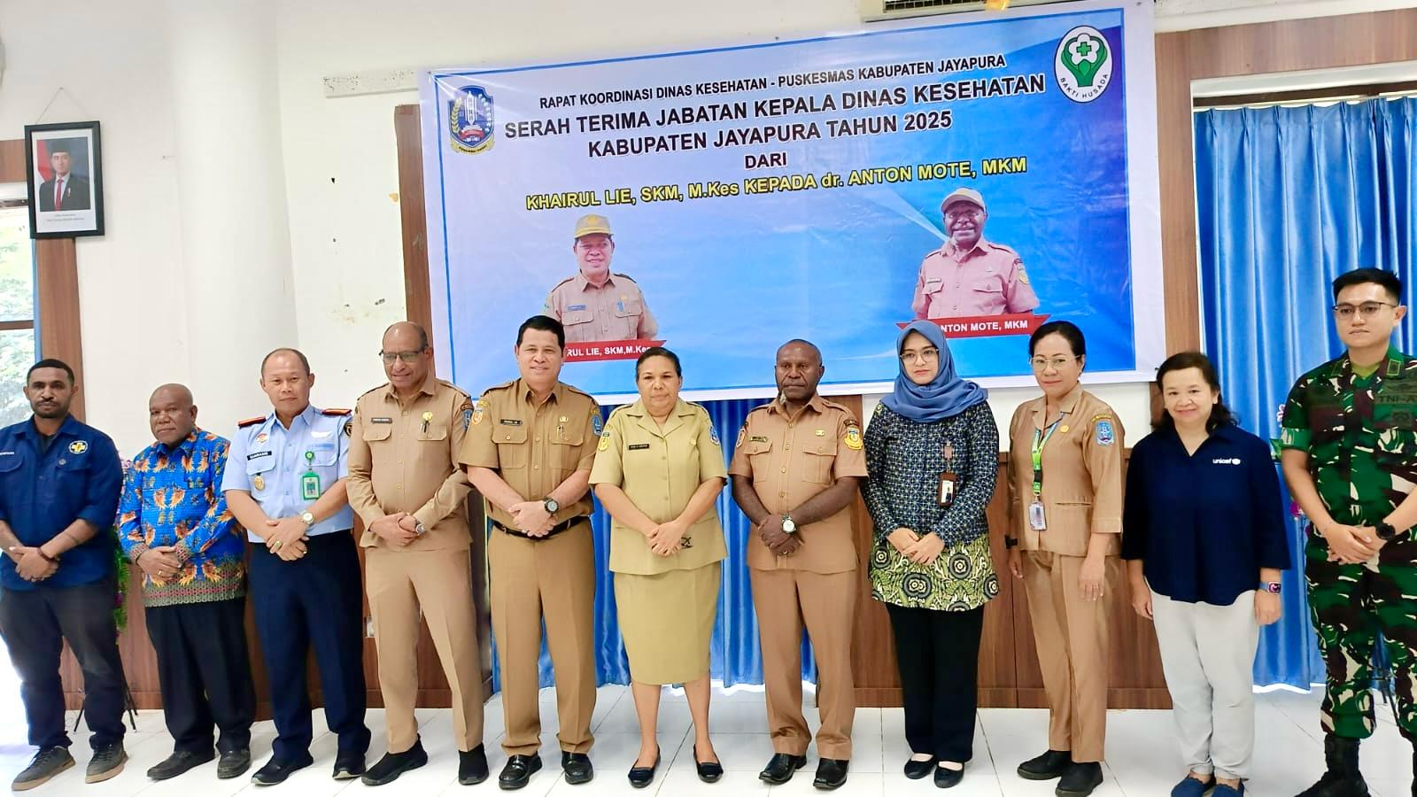 Jayapura, fajarpapua.com – Serah Terima Jabatan Kepala Dinas Kesehatan Kabupaten Jayapura Tahun 2025 dari Khairul Lie, SKM., M.Kes kepada dr. Anton Tony Mote, M.KM yang berlangsung di aula kantor Dinas Kesehatan, Selasa, 29/04/2025.