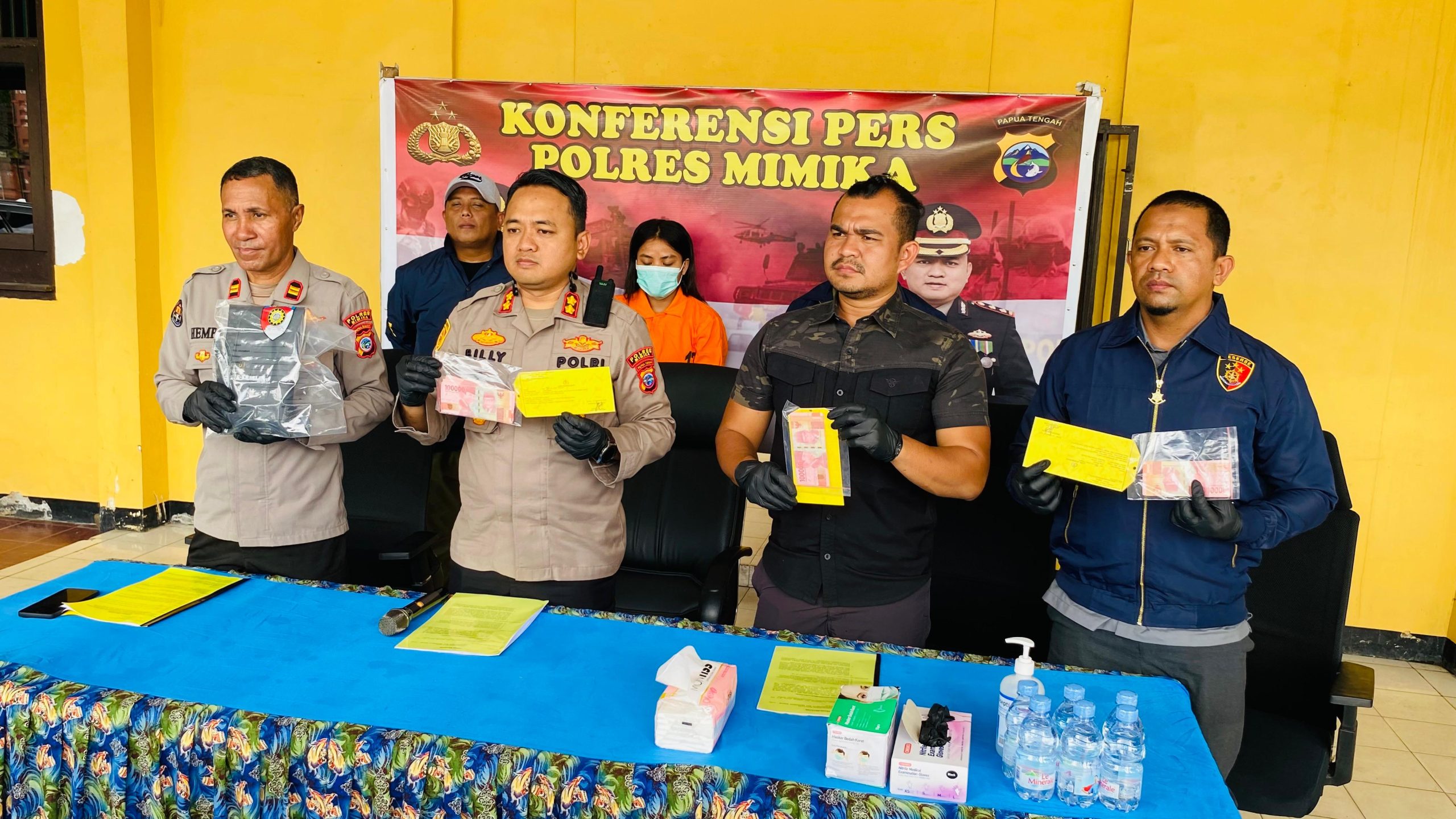 “Setelah menerima laporan, tim mendatangi rumah kos pelaku Mayang. Saat diamankan, ia mengakui memiliki uang palsu yang diperoleh dari oknum TNI TMA alias R sebanyak 100 lembar. Sebagian uang itu dibuang di balkon kamarnya,” jelas Kapolres saat konferensi pers di Mako Polres Mimika, Mile 32, Kamis (18/9) lalu.