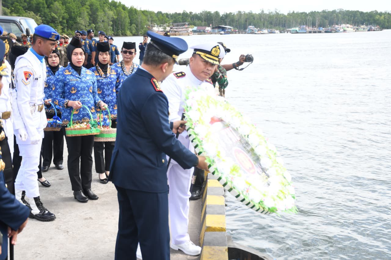 Rangkaian upacara berlangsung khidmat, dimulai dengan penghormatan kepada arwah pahlawan, mengheningkan cipta, hingga pelarungan karangan bunga ke laut oleh Inspektur Upacara. (ron)