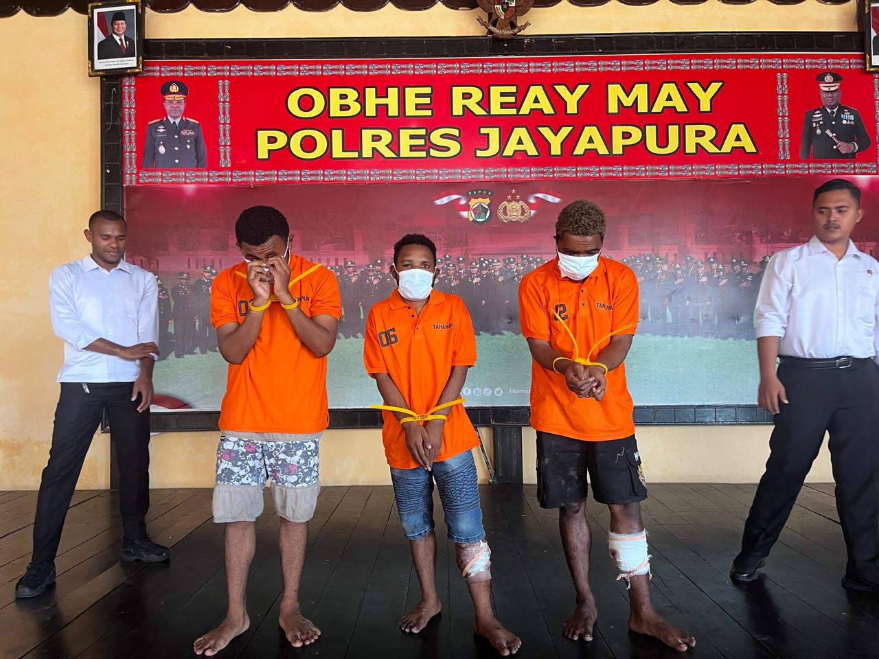 Wakapolres Jayapura Kompol Erol Sudrajat didampingi Kasat Reskrim Polres Jayapura AKP Alamsyah Ali menuturkan, dari lima orang pelaku, baru tiga orang tersangka yang telah berhasil ditangkap yakni HU (18), YN (19) dan HVK (18) sementara dua tersangka lainnya masih dalam pengejaran dan sudah masuk Daftar Pencarian Orang (DPO).