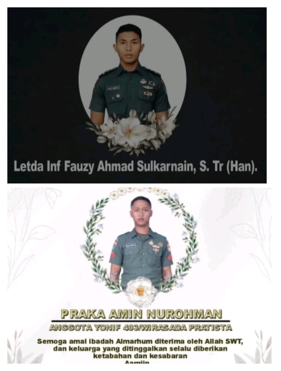 Dalam insiden tersebut, seorang anggota Yonif 403/Wirasada Pratista, Satgas Pamtas Kewilayahan Yonif 410/Alugoro Praka Amin Nurohman, juga dilaporkan meninggal dunia akibat tertembak.