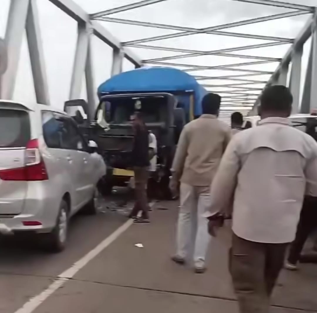 Namun, truk lain yang berada di belakang turut berusaha melambung, hingga kehilangan kendali dan menabrak mobil dinas jenis Avanza berwarna silver yang berada di jalur berlawanan.