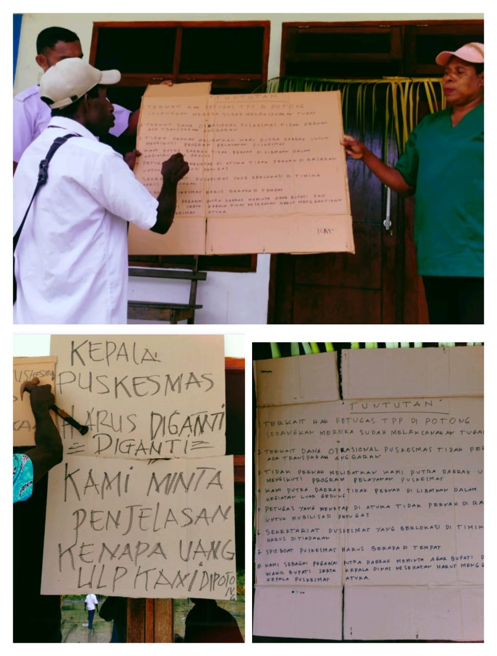 Dalam aksinya, para pegawai menyampaikan sejumlah tuntutan, termasuk permintaan agar Kepala Puskesmas Atuka segera diganti.