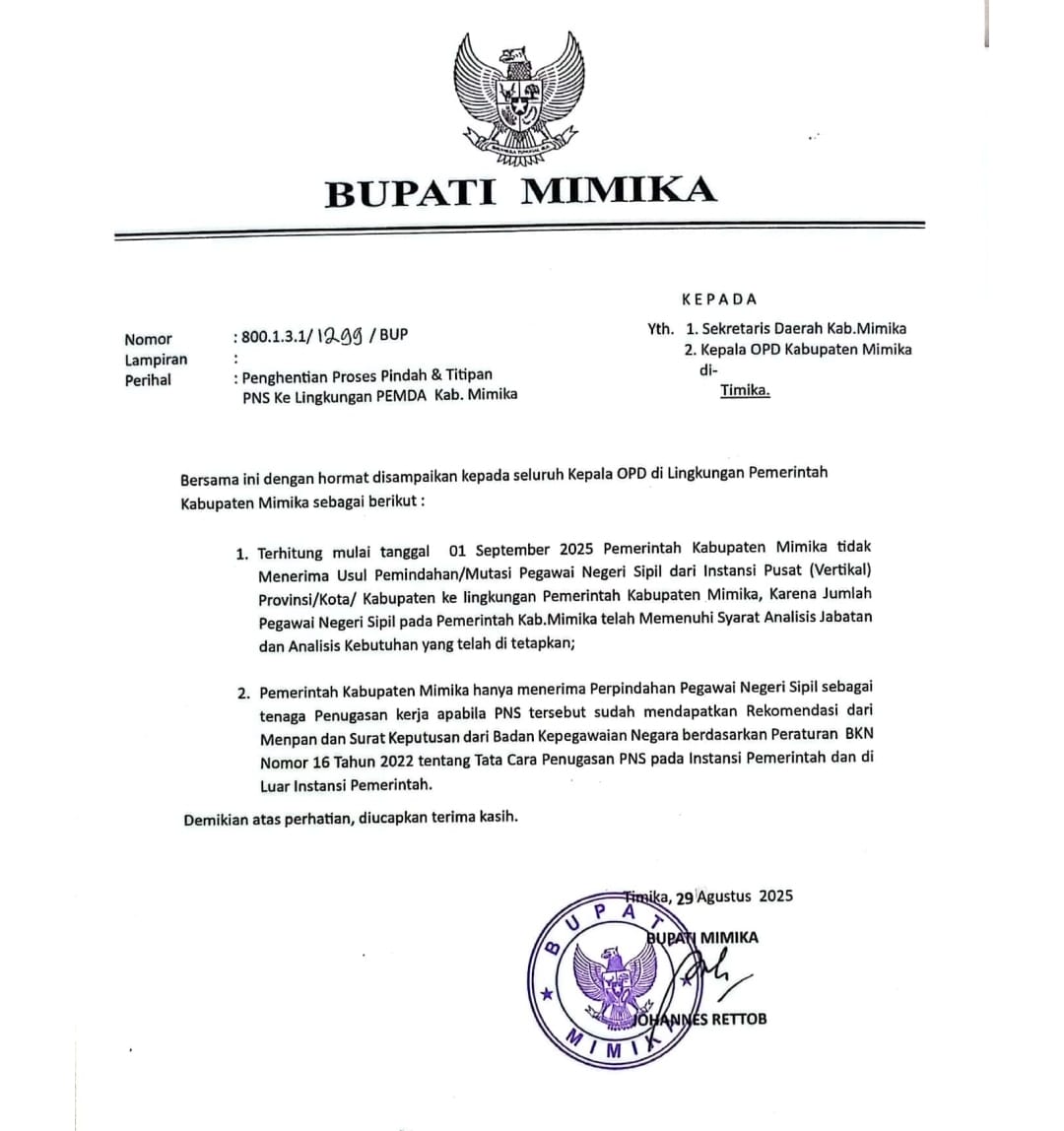 Dalam surat tersebut, Bupati Mimika Johannes Rettob menegaskan terhitung mulai 1 September 2025, Pemkab Mimika tidak lagi menerima usulan pemindahan atau mutasi PNS dari instansi pusat, vertikal, provinsi, maupun kabupaten/kota lainnya.