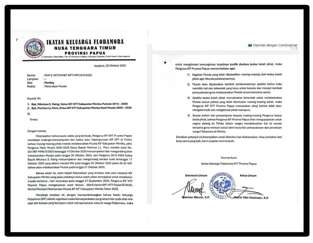 Keputusan ini tertuang dalam surat resmi bernomor 004/S.KETUM/IKF-NTT-PAPUA/X/2025 yang ditandatangani Ketua Umum IKF NTT Provinsi Papua, Stenis Hike Dosinaen, dan Sekretaris Umum, Melchior Weruin, di Jayapura pada 20 Oktober 2025.