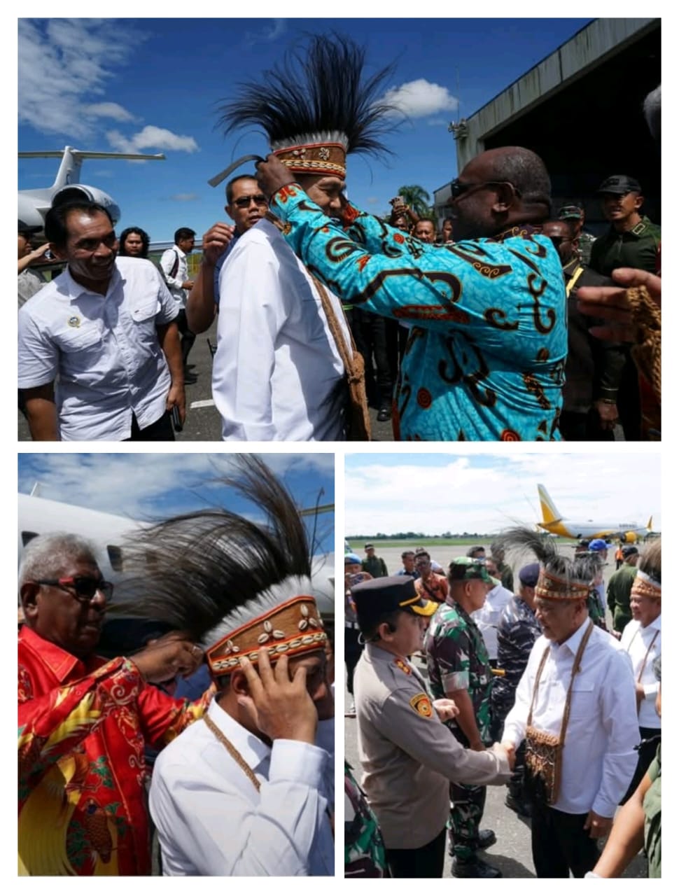 Dalam penyambutan tersebut, Menko Polhukam dan Kepala BIN menerima pengalungan noken serta mahkota khas Papua sebagai bentuk penghormatan adat.