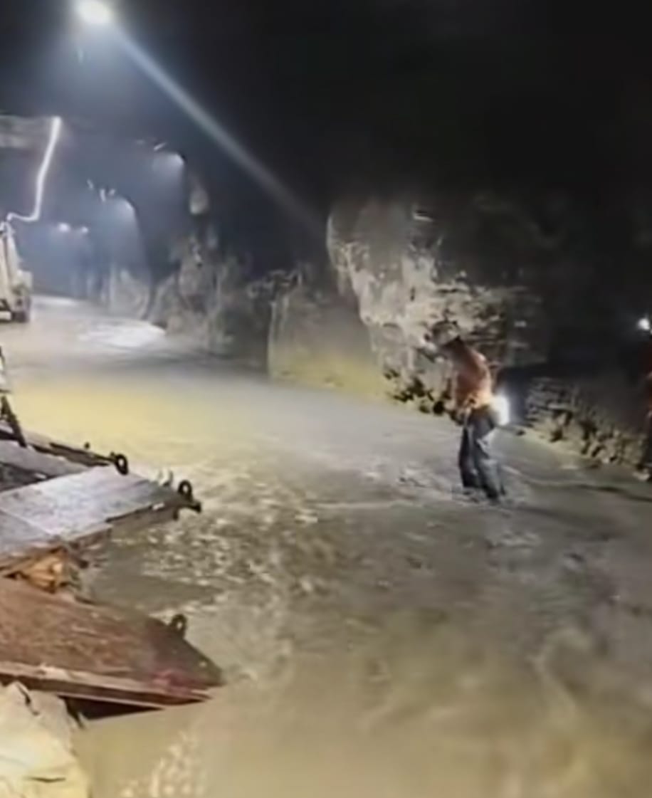 Rekaman juga memperlihatkan air bercampur lumpur mengalir deras di dalam terowongan, memperkuat gambaran mengenai kondisi medan yang dihadapi para karyawan.