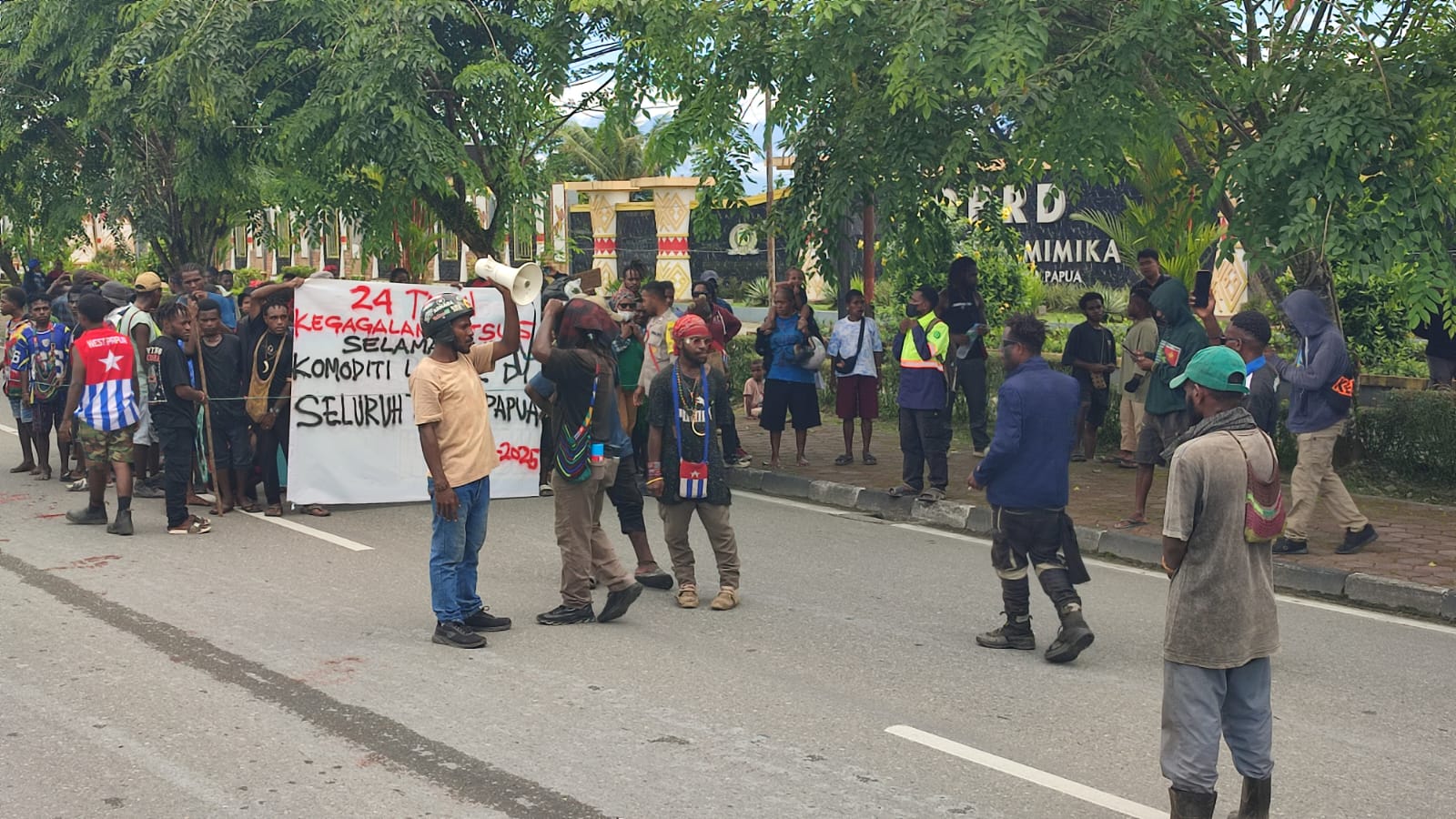 Aksi tersebut mengusung tema “24 Tahun Kegagalan Otonomi Khusus dan Selamatkan Komoditi Lokal di Seluruh Tanah Papua”.