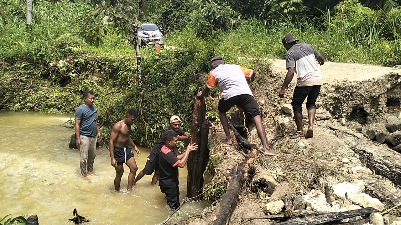 Untuk memastikan aktivitas warga tidak berhenti total, Polsek bersama masyarakat bergerak cepat memperbaiki bagian jembatan yang rusak menggunakan peralatan seadanya.