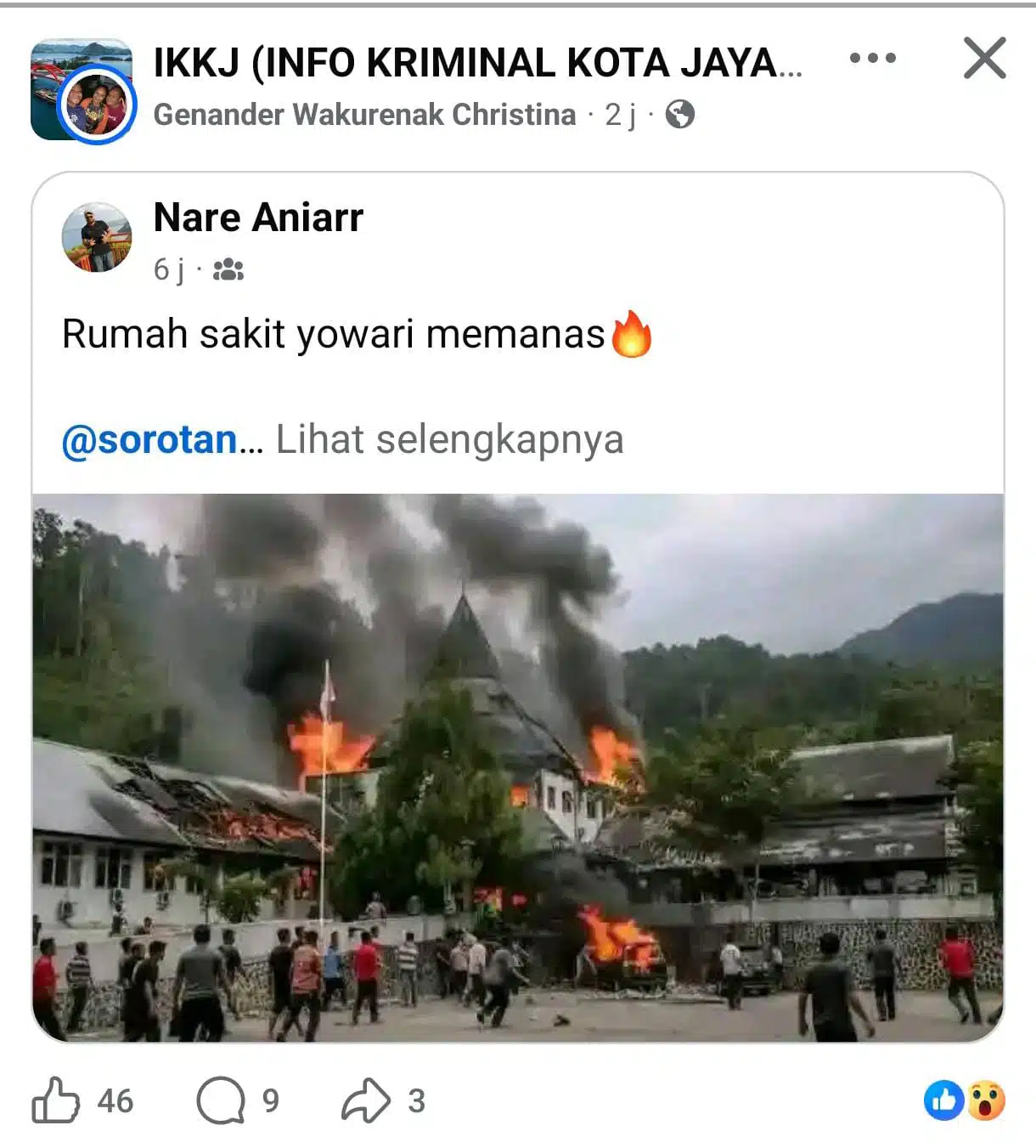 Jayapura, fajarpapua.com – Sebuah unggahan foto yang menarasikan bahwa Gedung Rumah Sakit Yowari Sentani dibakar dan diserang massa pasca meninggalnya seorang pasien ibu hamil beredar luas di media sosial sejak Minggu (23/11).