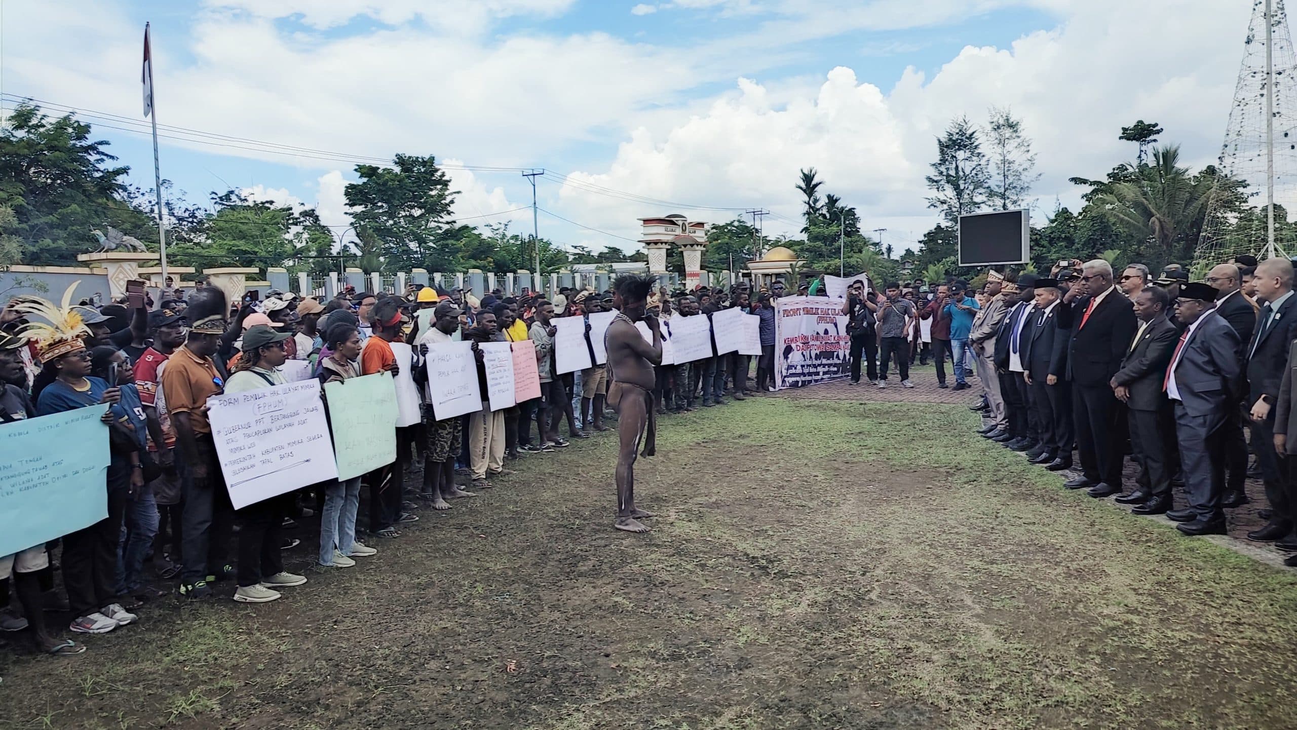 Timika, fajarpapua.com – Ratusan warga yang tergabung dalam Front Pemilik Hak Ulayat Mimika (FPHUM) melakukan aksi damai di lapangan Kantor Dewan Perwakilan Rakyat Kabupaten (DPRK) Mimika, Selasa (25/11).
