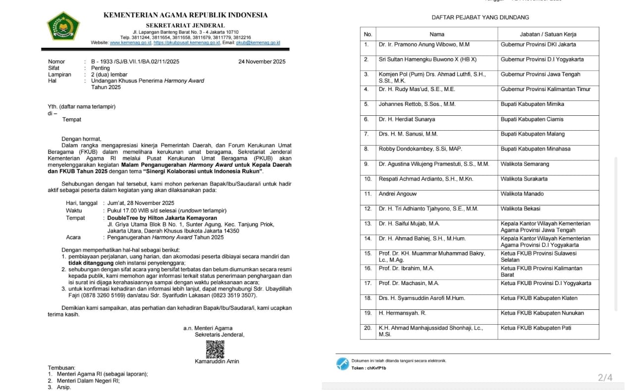 Jakarta, fajarpapua.com – Sebanyak 25 pejabat penting dari berbagai daerah di Indonesia tercatat masuk dalam daftar tamu undangan khusus penerima Harmony Award 2025, yang digelar Kementerian Agama Republik Indonesia melalui Pusat Kerukunan Umat Beragama (PKUB).