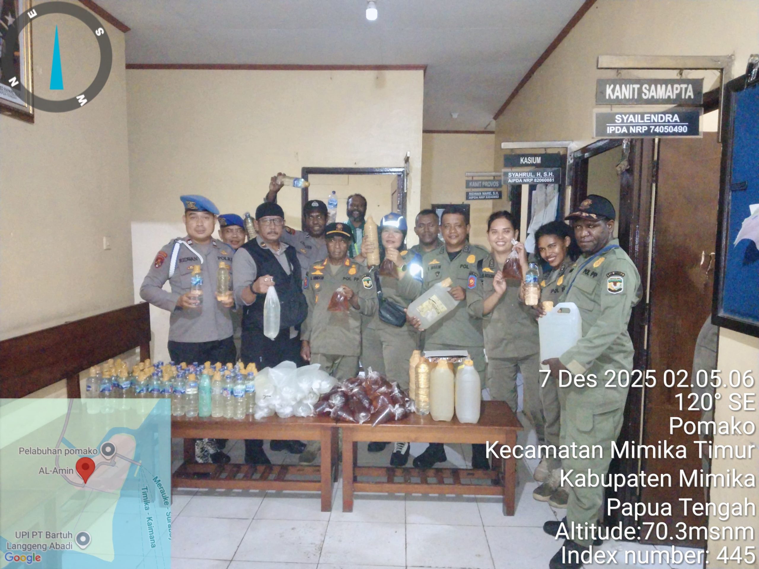 Timika, fajarpapua.com – Polsek Kawasan Pelabuhan Pomako bersama Lanal Timika dan Syahbandar mengamankan 128 liter minuman keras (miras) lokal jenis sopi dari penumpang Kapal Motor (KM) Tatamailau. Kapal yang berangkat dari Tual, Maluku Tenggara, ini bersandar di Pelabuhan Pomako pada Sabtu (6/12).