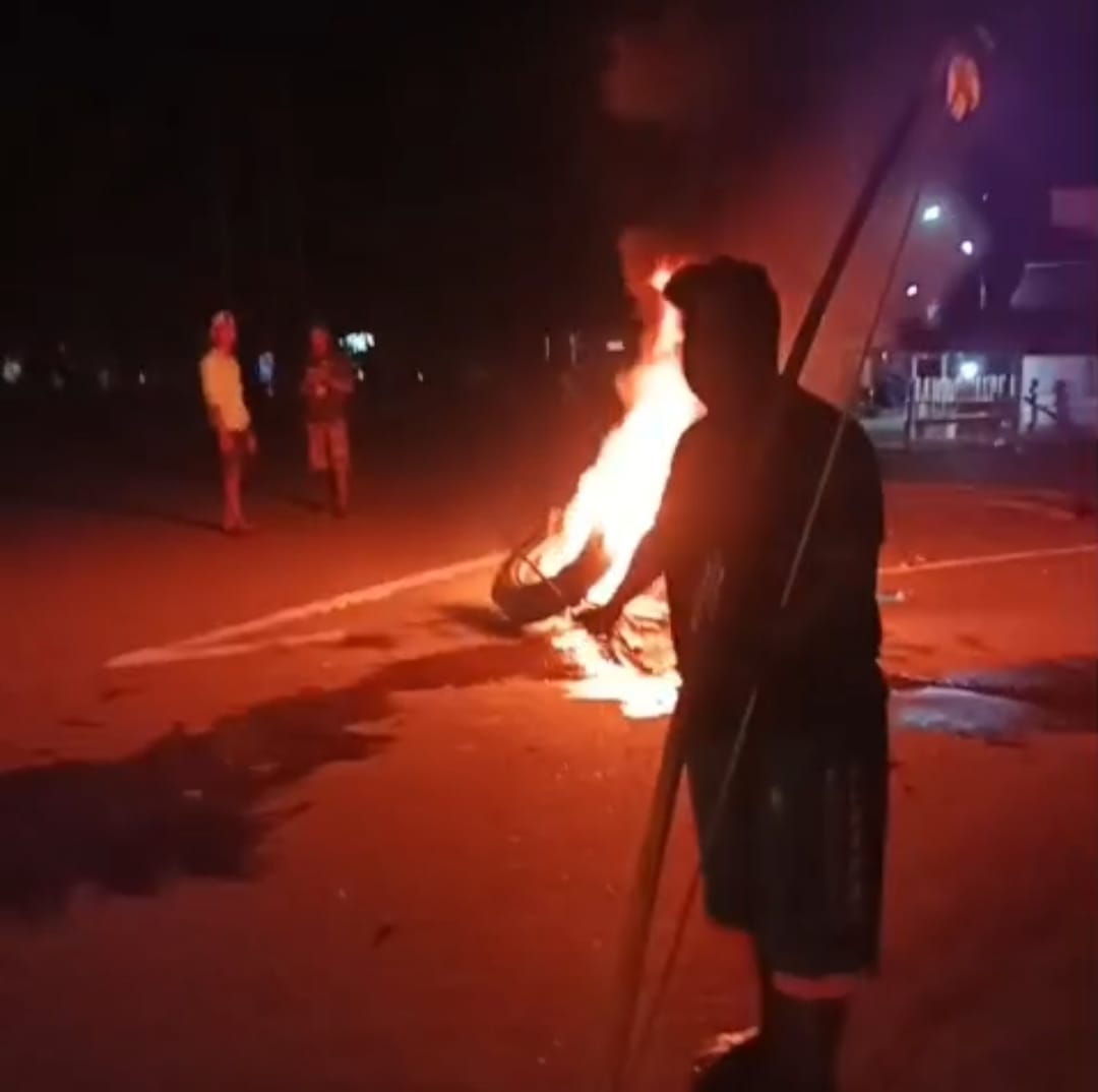 Dalam video berdurasi 4 menit 6 detik yang beredar, tampak keluarga dan warga melakukan pembakaran ban di tengah jalan.
