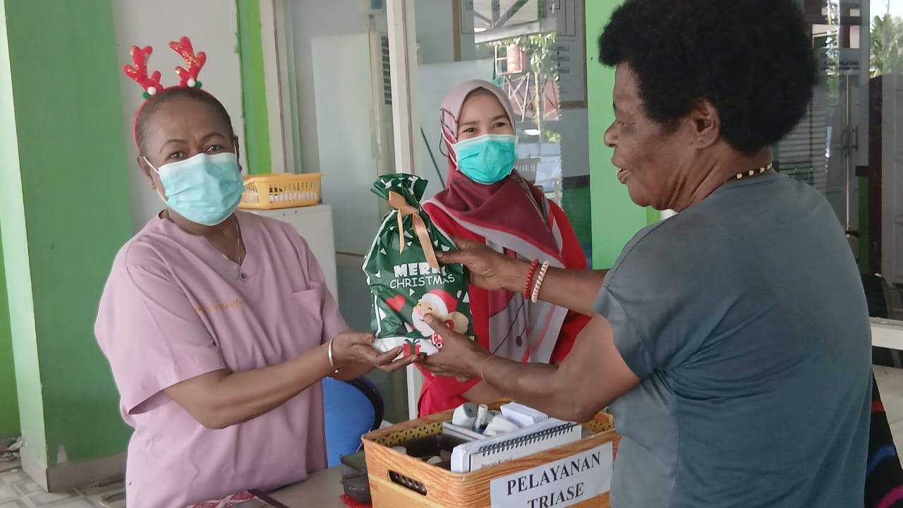 Selain memberikan pelayanan medis seperti biasa, Puskesmas Timika juga menghadirkan nuansa kasih Natal dengan membagikan bingkisan kepada para pasien yang datang berobat, Sabtu (20/12).