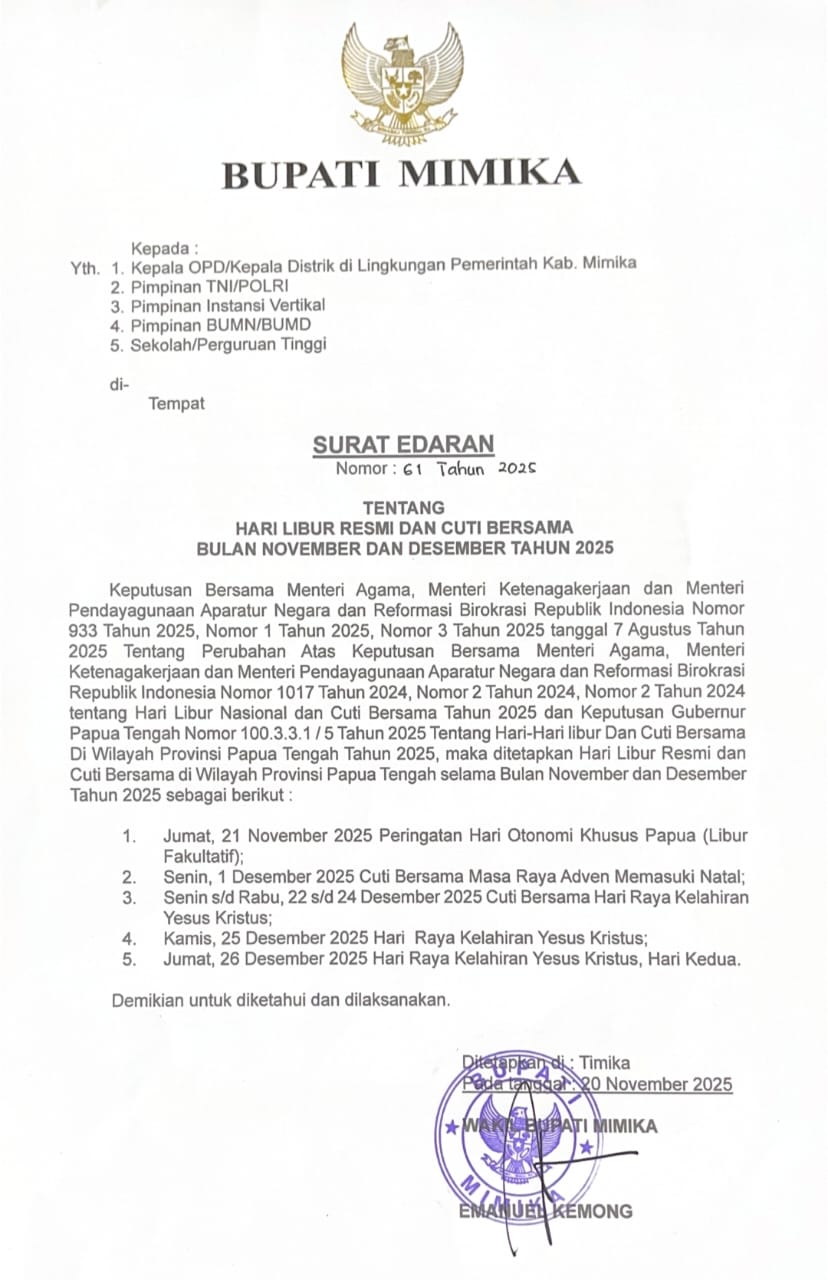 Penetapan libur dan cuti bersama tersebut tertuang melalui Surat Edaran Bupati Mimika Nomor 61 Tahun 2025 yang ditetapkan di Timika pada 20 November 2025 dan ditandatangani oleh Wakil Bupati Mimika, Emanuel Kemong.