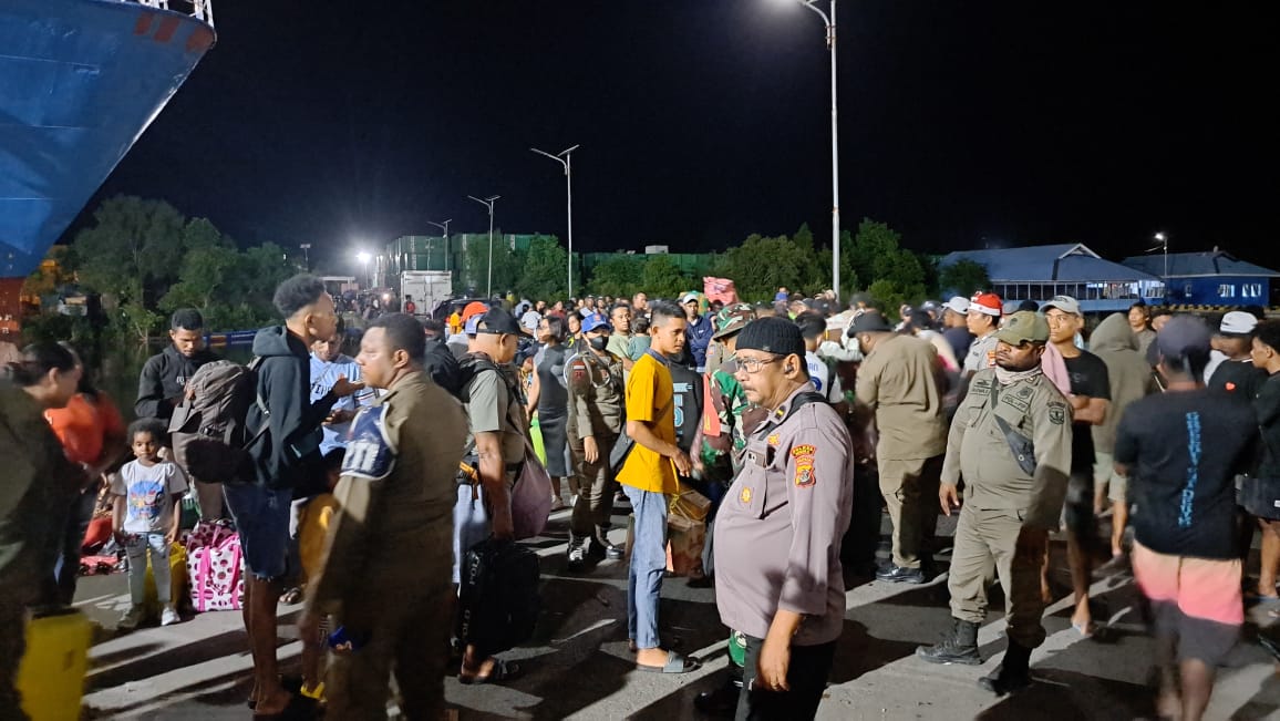 Timika, fajarpapua.com – Personil gabungan melakukan pengamanan dan sweping terhadap penumpang kapal KM Sirimau rute Tual–Dobo, Maluku Tenggara, saat kapal sandar di Pelabuhan Pomako, Selasa (23/12) pukul 01.00 WIT.