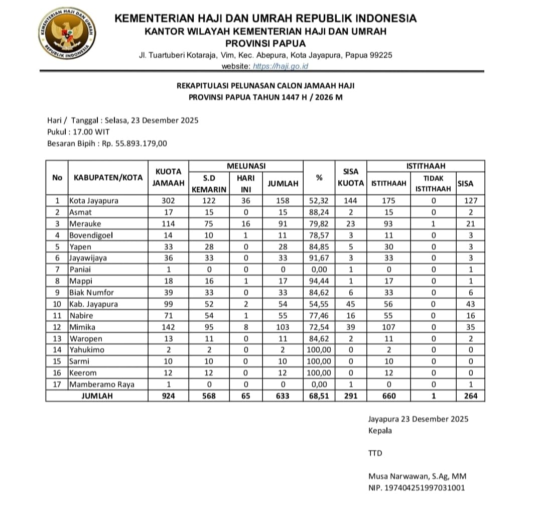 Sementara untuk area Kantor Wilayah Kementerian Haji dan Umrah Provinsi Papua hingga Selasa, 23 Desember 2025 pukul 17.00 WIT, tingkat pelunasan haji baru mencapai 68,51 persen dari total kuota yang tersedia.