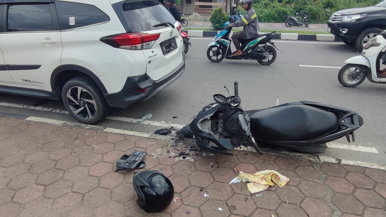 Timika, fajarpapua.com – Satu unit sepeda motor yang melaju dari arah Bundaran Petrosea Timika menuju perempatan Diana Mall menabrak bagian belakang mobil yang sedang parkir di Jalan Cenderawasih Timika, Rabu (31/12).