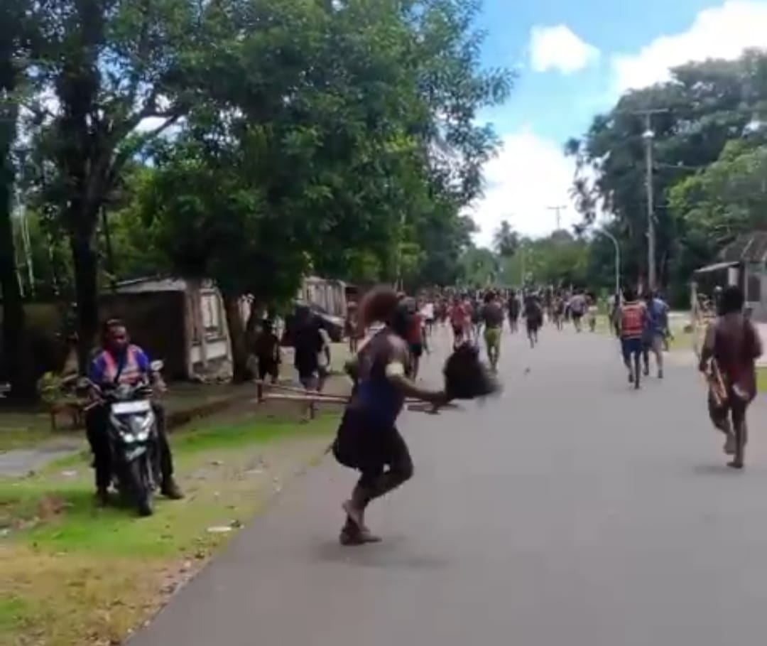 Pantauan lapangan, keluarga dan kerabat korban tampak membawa panah dan berlarian di jalan utama Distrik Kwamki Narama. Aksi tersebut sebagai bentuk pelampiasan kemarahan atas kematian korban.