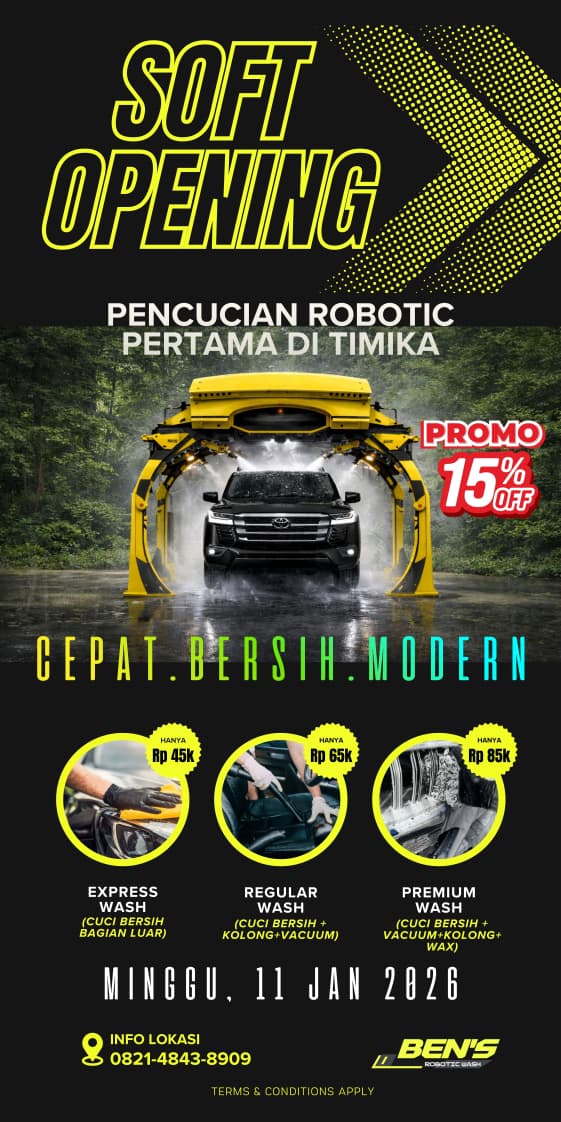 Timika, fajarpapua.com – Layanan pencucian kendaraan berbasis teknologi modern resmi hadir di Kota Timika. Ben’s Robotic Wash menggelar soft opening pencucian robotic pertama di Timika pada Minggu, 11 Januari 2026, dengan menghadirkan konsep cuci mobil cepat, bersih, dan modern.