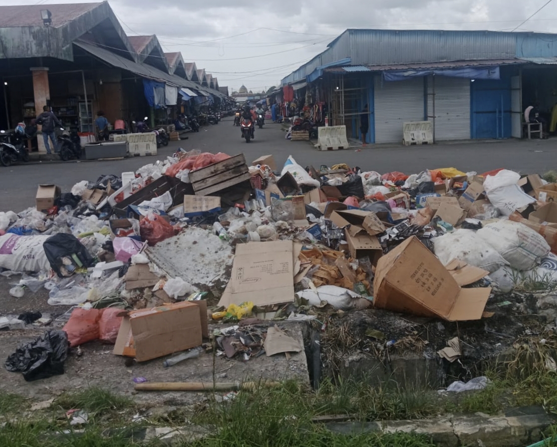 Pantauan di lapangan menunjukkan, sampah terlihat menumpuk di sejumlah titik di dalam dan sekitar area pasar.