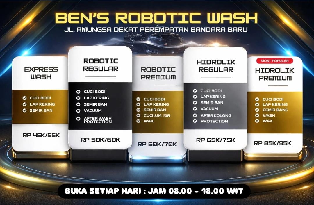 Mengusung konsep cepat, bersih, dan modern, Ben’s Robotic Wash menawarkan berbagai paket dengan harga terjangkau untuk masyarakat.
