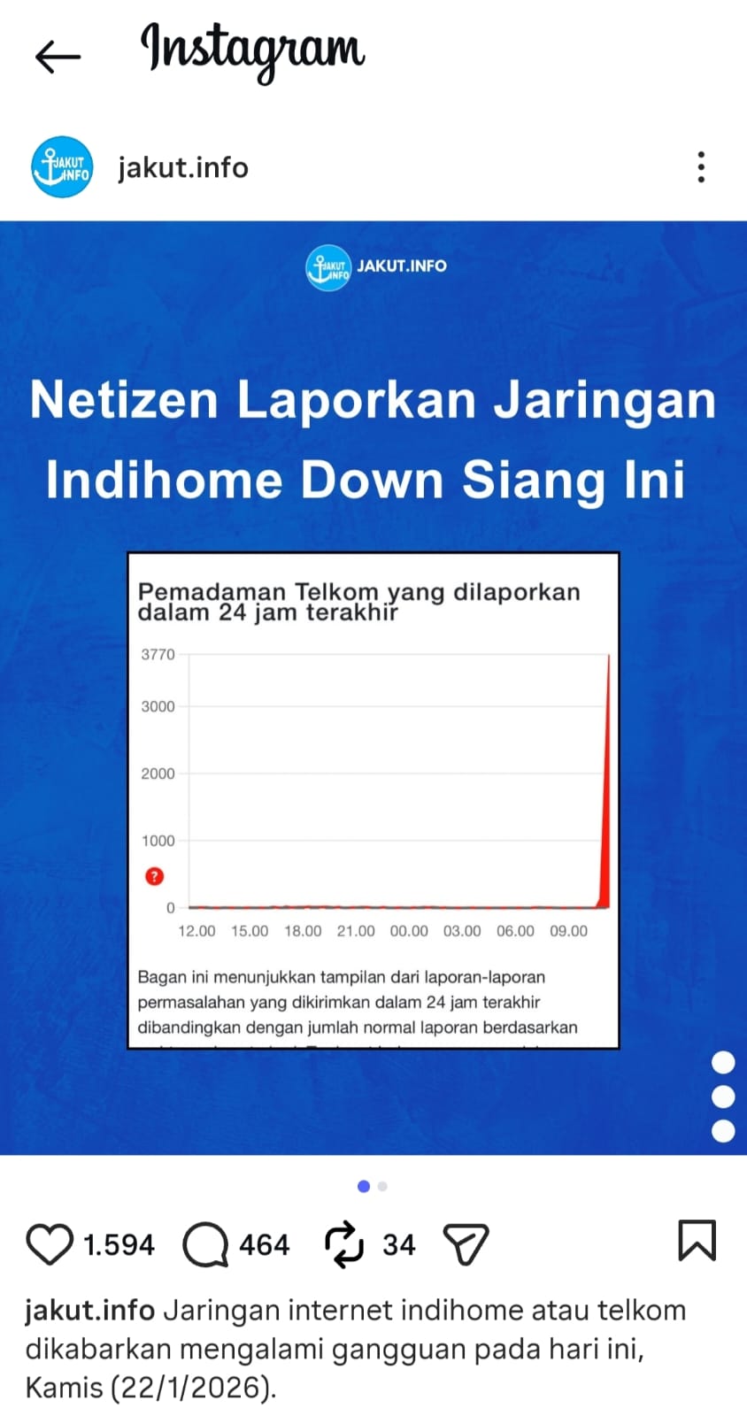 Akun Instagram @jakut.info juga mengunggah informasi adanya gangguan jaringan Indihome disejumlah kota besar di Indonesia.