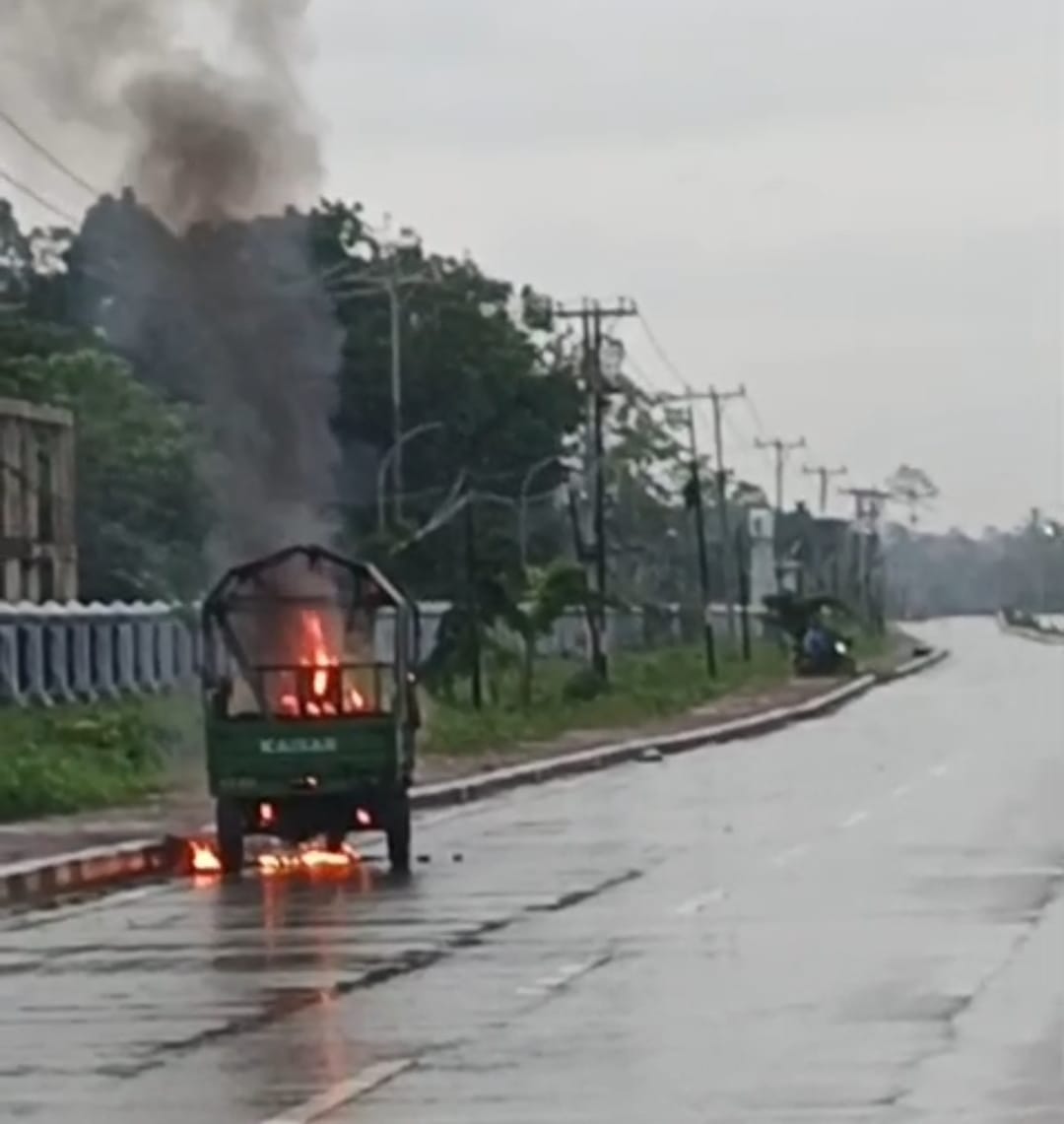 Namun setelah mendekat ke lokasi, terlihat jelas bahwa asap berasal dari satu unit motor roda tiga yang sedang terbakar di badan jalan.