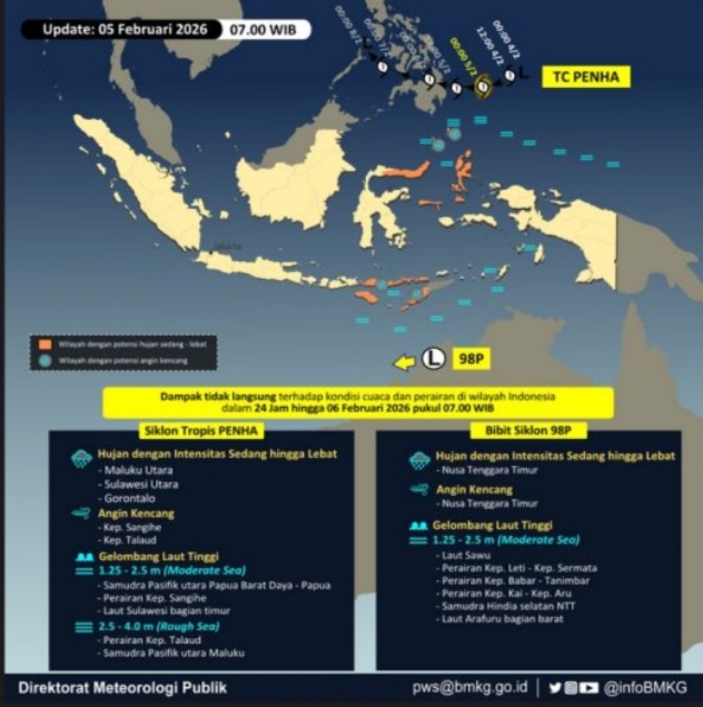 BMKG memprakirakan pada 15 hingga 16 Februari potensi hujan lebat berpeluang terjadi di Aceh, Sumatera Utara, Sumatera Barat, Bengkulu, Lampung, Banten, DKI Jakarta, Jawa Barat, Jawa Tengah, DI Yogyakarta, Jawa Timur, Bali, Nusa Tenggara Barat, Sulawesi Utara, Papua Pegunungan, dan Papua.