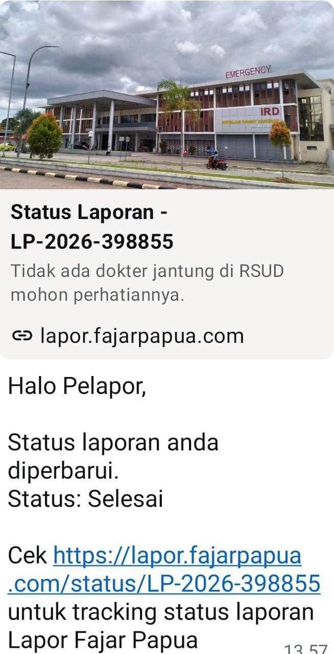 “Dokter jantung sudah ada bernama Dr. Alfin Ridha Ramadhan, SpJP, FIHA, dan sudah bertugas mulai tanggal 19 Januari 2026 lalu,” jelasnya dalam tanggapan yang disampaikan melalui Dashboard Lapor Fajar Papua.