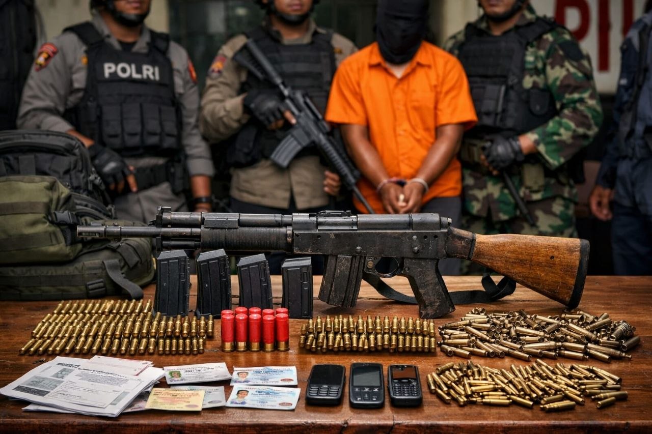 Dari hasil pengungkapan tersebut, aparat mengamankan sejumlah barang bukti berupa satu pucuk senjata api rakitan laras panjang, 298 butir amunisi berbagai kaliber, lima buah magazen senjata, beberapa unit telepon genggam, serta tas dan dokumen identitas yang diduga berkaitan dengan aktivitas para pelaku.
