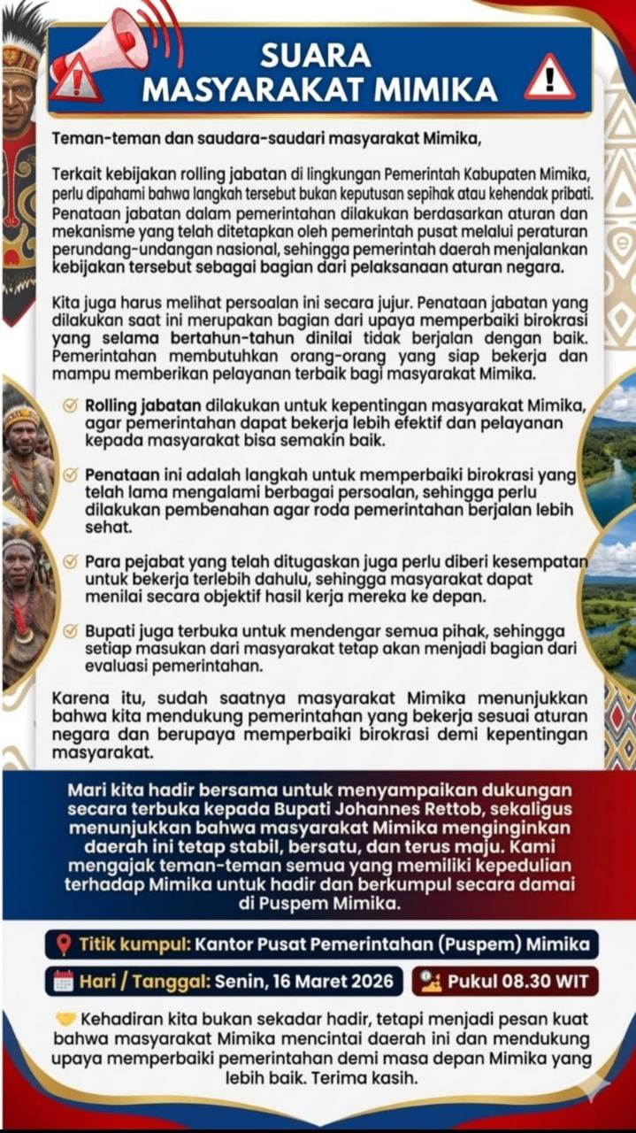 Aksi ini dilakukan sebagai bentuk dukungan masyarakat terhadap kebijakan penataan birokrasi, termasuk rolling jabatan di lingkungan Pemerintah Kabupaten Mimika yang belakangan menjadi perhatian publik.